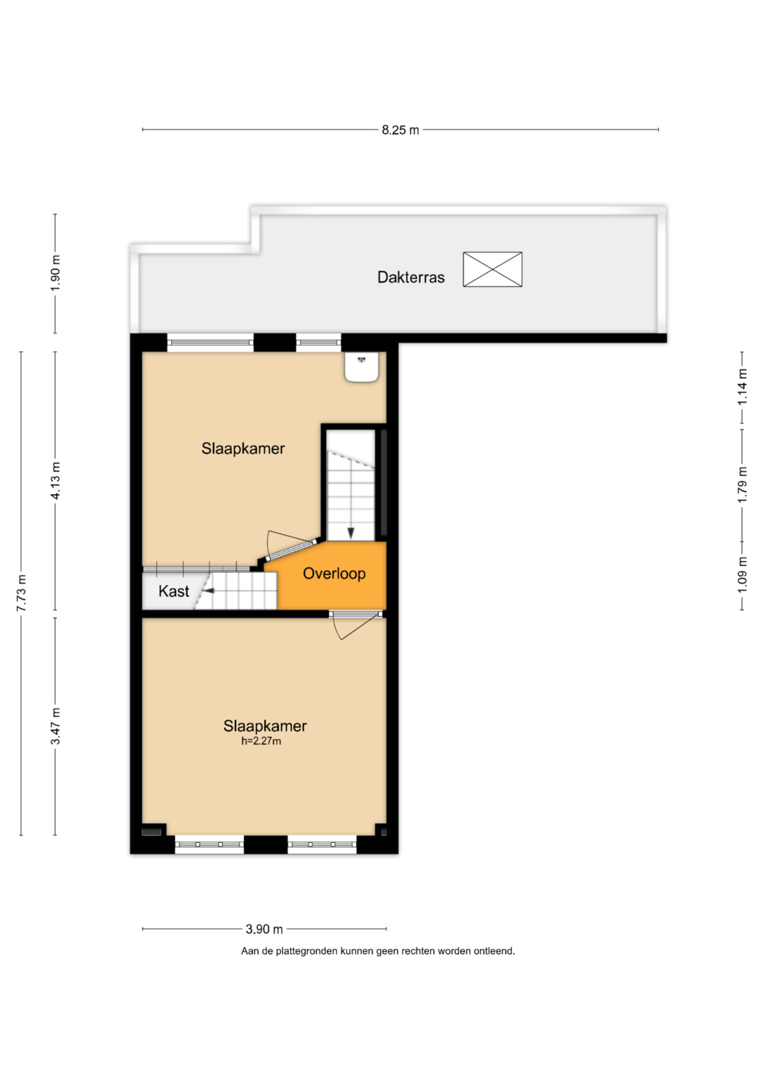 Vanaf de begane grond leidt een vaste trap vanuit de woonkamer naar de eerste verdieping. Hier kom je terecht op de overloop met vaste trap naar de zolder. De eerste verdieping beschikt over twee slaapkamers. Eén van deze slaapkamers biedt uitzicht op de Basiliek van Oudenbosch. Vanuit de achterste slaapkamer is er directe toegang tot het dakterras via een raam.